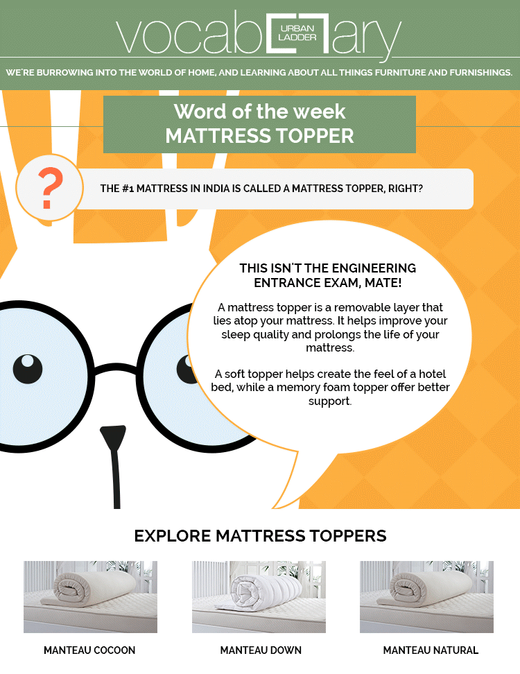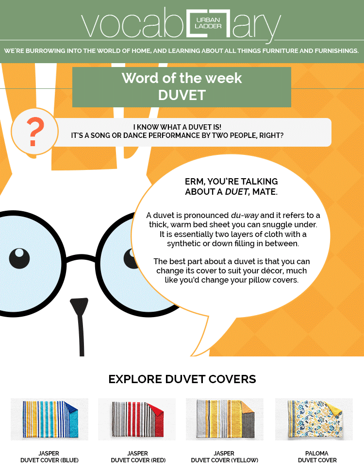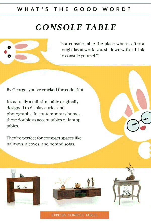 When I first joined Urban Ladder, I didn’t know many design and decor terms. So, chenille meant nothing to me. Neither did console table, sectional, armoire, or chaise. We knew that many of our customers would be in the same boat and would appreciate a simple, pithy explanation for such “technical” terms. From that thought came a series of creatives that we put out through our (then) wildly popular newsletters and social media channels.