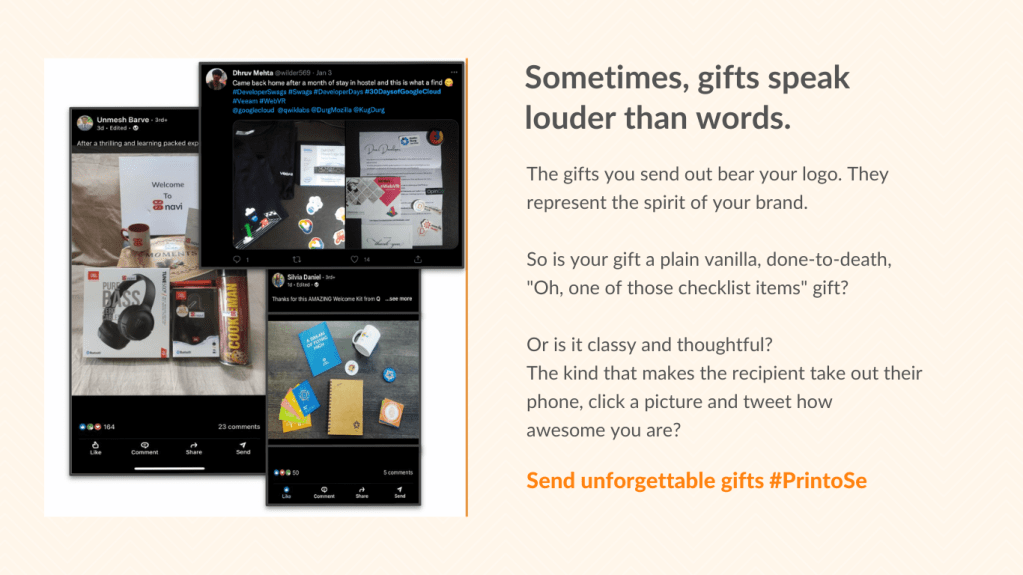 The goal: Printo had established itself as a go-to place for retail customers (individuals) to take document printouts, print photo books, and create custom gifts. The business team had curated extensive offerings to serve the Corporate Gifting space and wanted to target the vibrant startup ecosystem in Bengaluru. The question was: how could one come up with messaging that resonated with this audience?